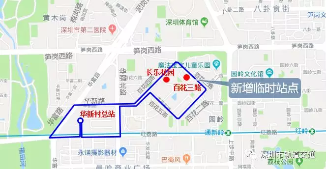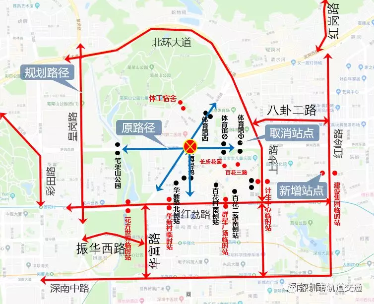 (2)原經(jīng)筍崗西路西行-華富路、泥崗西路南行-華富路-華新路到達(dá)的交通調(diào)整為:上步路-紅荔路-華強北路-華新路/上步路-筍崗西路-百花四路-華新路。