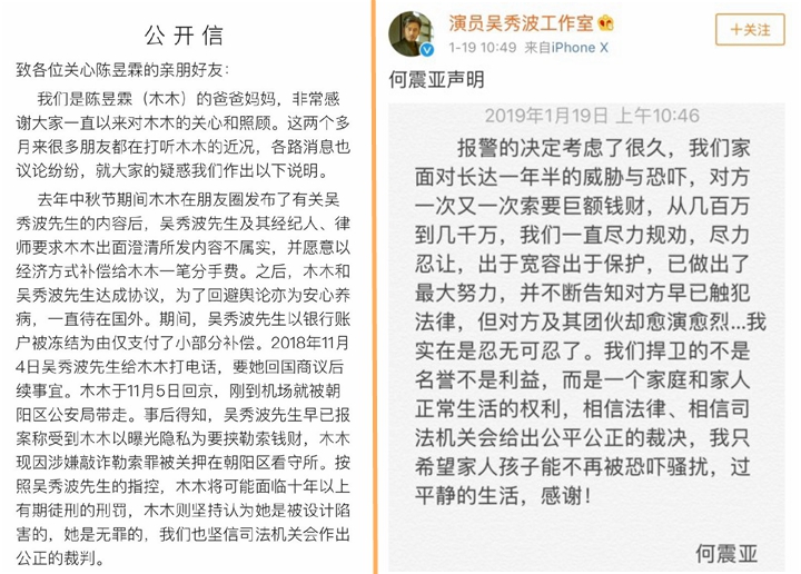深圳新聞網(wǎng)1月22日訊(記者 張玲)近日,演員吳秀波婚內出軌事件再度發(fā)酵在微博引發(fā)熱搜,而這次事件的主角則是之前銷聲匿跡已久的陳昱霖(藝名)。2019年1月18日,陳昱霖父母微博公開發(fā)表聲明稱女兒被吳秀波欺騙回國后,吳秀波以“曝光隱私威脅勒索錢財”為由報警,女兒在下飛機后即被警方抓捕。隨后,吳秀波妻子何震亞發(fā)表聲明反擊,稱陳昱霖多次威脅索要巨額財務,數(shù)額一度高達千萬,在忍無可忍的情況下才選擇報警,希望通過司法途徑維護自己的權益。