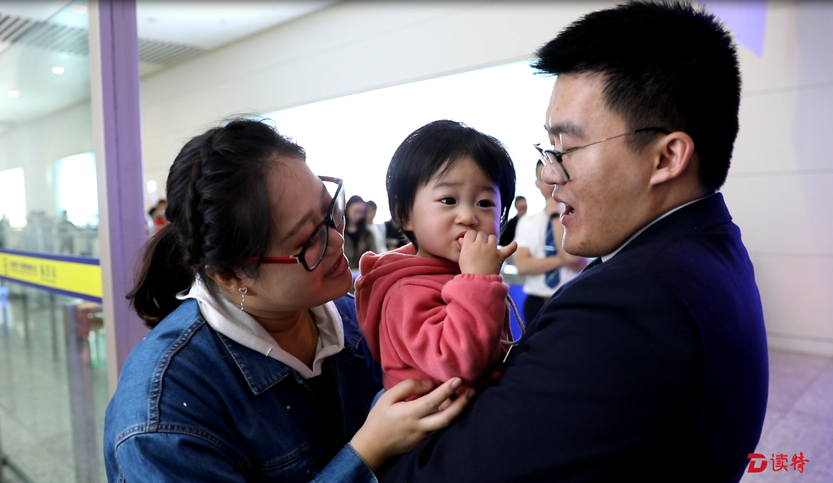 中午12點,終于到了下班交接的時候,這也是李樹森最期待的一刻。他的妻子張焱茹也是福田高鐵站的客運員,兩口子在同一個站里值“對班”,他下班的時候,正是妻子上班的時候,因此,只有在交班時,他們才能見上一面。而且,他們還要做一件很重要的事,那就是交接孩子。女兒“丸子”今年剛滿一歲,張焱茹把孩子從家里帶來,交給下班的李樹森輪流照顧。