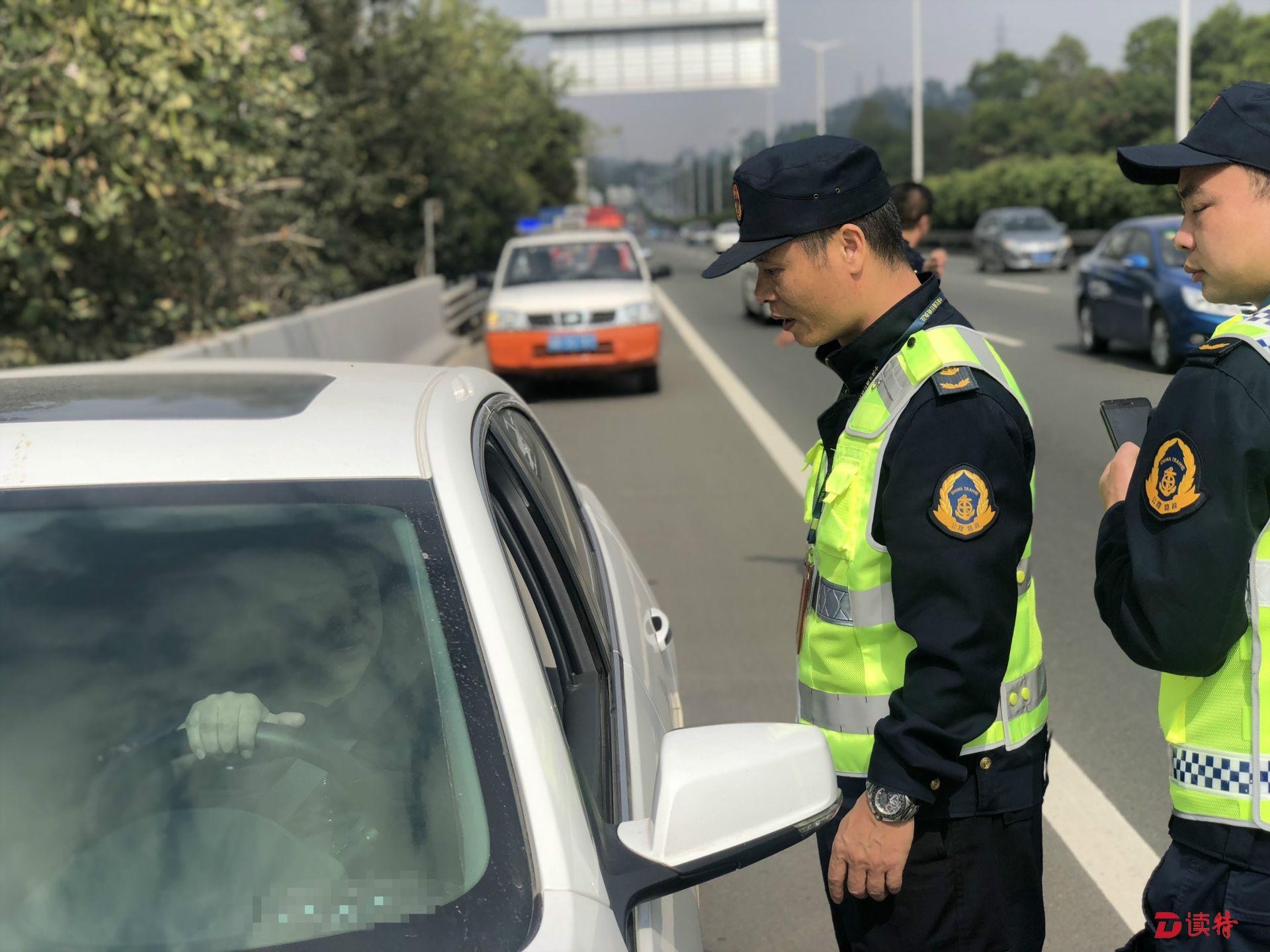 11:20,南光高速光明路段路邊應(yīng)急車道上,有一輛小車???。馬明海和開(kāi)車的老林一起下車,走過(guò)去詢問(wèn)。原來(lái)這輛小車爆胎了,正在等待維修廠送備胎過(guò)來(lái)。馬明海讓車內(nèi)司機(jī)和乘客趕緊下車,盡量往路邊站。“以前高速公路上出過(guò)這樣的事故,小車拋錨后,車主沒(méi)有下車,結(jié)果后面的車輛沒(méi)注意撞上來(lái),車內(nèi)的人都沒(méi)了?!崩狭盅a(bǔ)充道:“下車后也不能站在車前或車后,這些位置都很危險(xiǎn),最好站到高速護(hù)欄的外面去等待救援?!笨吹綊佸^車輛后面只放了一個(gè)很小的三角架,馬明?;氐窖矙z車上,拿下來(lái)兩個(gè)反光錐放到小車后:“一定要讓其他車輛能很遠(yuǎn)就看到這里有車輛??浚f(wàn)不能發(fā)生二次事故?!?/p>