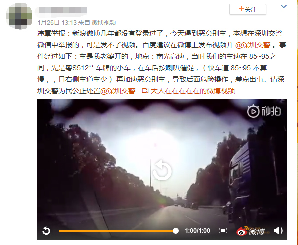 近日,有網(wǎng)友在微博爆料稱(chēng)自己的車(chē)在高速上遇到惡意別車(chē),并 @深圳交警,爆料原文如下。