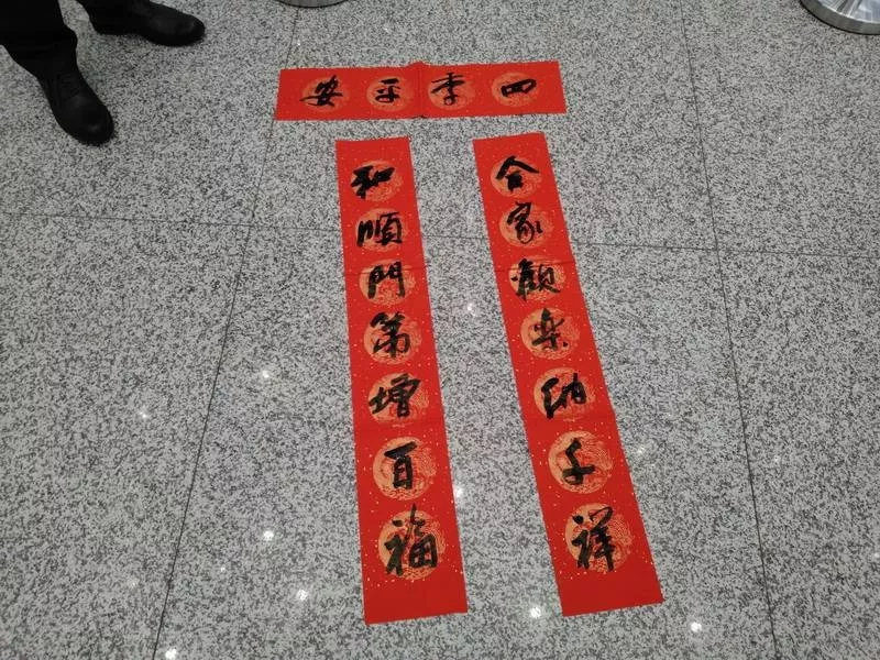 來自山東的譚先生剛從越南河內(nèi)務(wù)工回來,準(zhǔn)備轉(zhuǎn)機回山東煙臺,他選擇了“合家歡樂納千祥,和順門第增百?!?表達了他對家庭美滿的祝福。