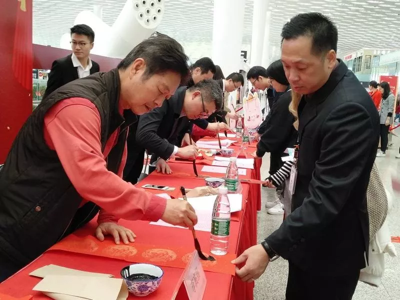 ▲越來越多的旅客來到送春聯(lián)活動現(xiàn)場,選好自己心儀的話語,由書法家們揮毫寫下。