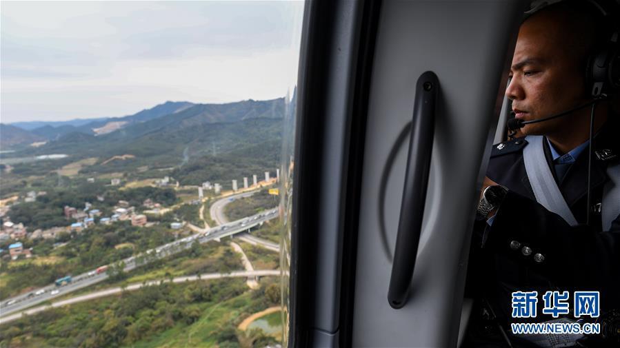 2月1日,深圳市公安局交通警察局指揮處民警劉松超在直升機(jī)上了解路面情況。2019年春運(yùn),深圳市公安局交通警察局開(kāi)啟陸空立體探路模式,首次啟用直升機(jī)探路。據(jù)介紹,此次直升機(jī)探路將開(kāi)展5次,屆時(shí)交警選取代表性線路從空中探察路面情況,及時(shí)為司機(jī)提供立體交通通行指引。新華社記者 毛思倩 攝