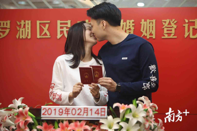 我們結(jié)婚啦!2月14日情人節(jié),一大早,深圳市羅湖區(qū)民政局婚姻登記處迎來許多對(duì)新人前來登記結(jié)婚。頒發(fā)證件、許下諾言、親密相吻……一對(duì)接一對(duì)的新人完成莊重的儀式,留下甜蜜蜜的合影,浪漫的氣息彌漫整個(gè)空間。南方日報(bào)記者朱洪波攝影報(bào)道