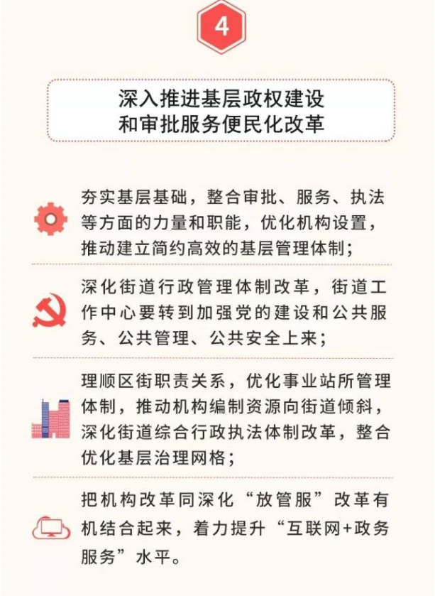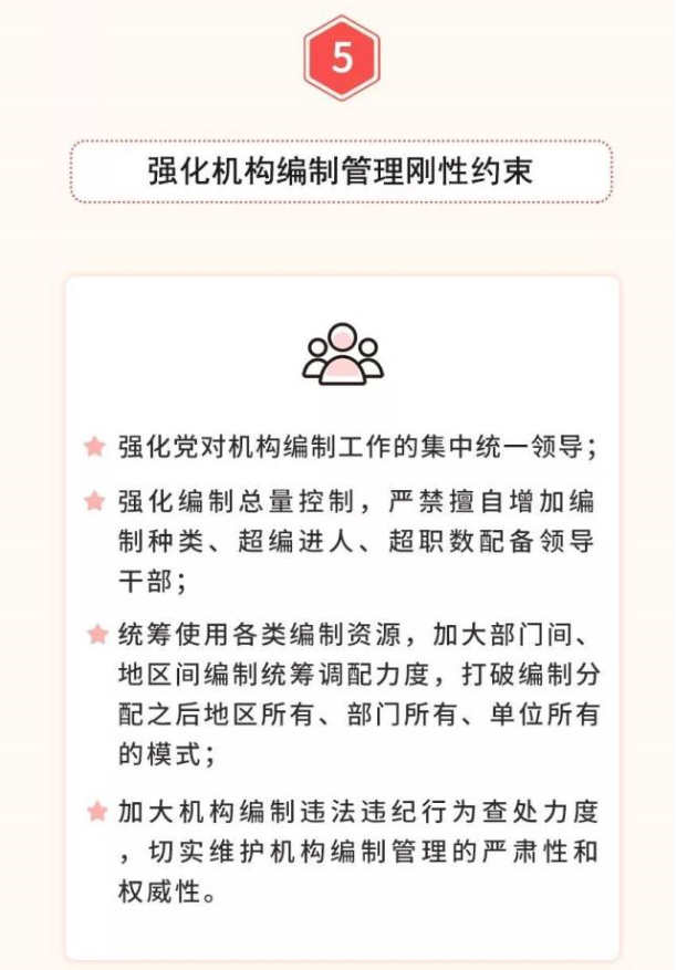 五是全面落實(shí)優(yōu)化協(xié)同高效原則。堅(jiān)持一件事情原則上由一個(gè)部門負(fù)責(zé),把理順職責(zé)放在重要位置,從有利于突出主業(yè)、有利于服務(wù)管理的角度出發(fā),實(shí)事求是,科學(xué)設(shè)置黨委和政府機(jī)構(gòu),宜大則大、宜小則小,該加強(qiáng)的加強(qiáng)、該精簡(jiǎn)的精簡(jiǎn)、該優(yōu)化的優(yōu)化,實(shí)現(xiàn)機(jī)構(gòu)職責(zé)的深度融合。