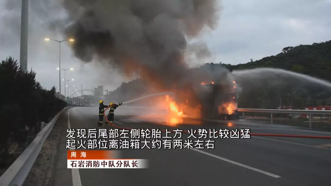 由于陳小姐及時(shí)報(bào)警,石巖消防中隊(duì)官兵在起火不久后便到達(dá)現(xiàn)場(chǎng)。到場(chǎng)后,消防立即要求還在救火的兩名司機(jī)撤離。