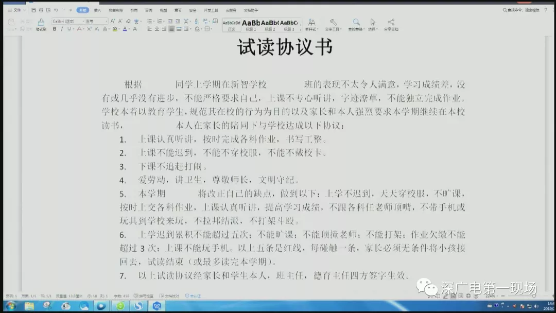 德育處主任說,新智學(xué)校從來沒有因?yàn)閷W(xué)生表現(xiàn)不好,就開除學(xué)生。雖然有家長簽了《試讀協(xié)議》,承諾學(xué)生只要觸碰“紅線”,試讀就宣告結(jié)束,家長就必須無條件將孩子帶回家。