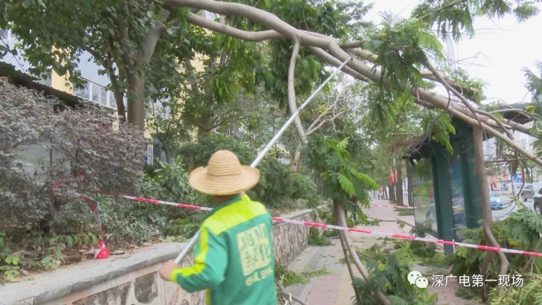 園林養(yǎng)護公司相關(guān)負責(zé)人介紹,這棵樹的樹名叫做南洋楹,記者觀察發(fā)現(xiàn),該路段種植的樹木基本都屬于這一樹種,但唯獨這一棵出現(xiàn)了樹枝折斷的情況。記者還在旁邊發(fā)現(xiàn)了一棵同樣的樹,樹干已經(jīng)被折斷,劉先生說,這還是去年9月份,被臺風(fēng)山竹吹斷的。像今天這種風(fēng)平浪靜的情況下斷枝,非常少見。