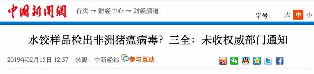 據(jù)紅星新聞報(bào)道,多家媒體稱,2月9日,湖南省湘西自治州重大動(dòng)物疫病防制指揮部辦公室接到省防治重大動(dòng)物疫病指揮部辦公室通知,要求瀘溪縣重大動(dòng)物疫病防制指揮部辦公室對(duì)來源于吉首市凌云冷凍食品批發(fā)部凍庫的產(chǎn)品進(jìn)行抽樣,在瀘溪縣好又多和萬家福兩家超市共抽取4個(gè)批次12份樣品,經(jīng)州動(dòng)物疫病預(yù)防控制中心檢測(cè),其中由河南三全食品有限公司生產(chǎn)批次為20190113H的“三全灌湯水餃”3份樣品為非洲豬瘟病毒核酸陽性。