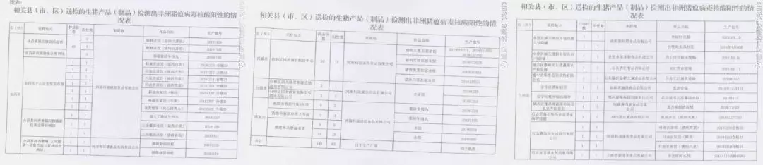 該網(wǎng)友貼出的3張照片顯示為“相關(guān)縣(市、區(qū))送檢的生豬產(chǎn)品(制品)檢測(cè)出非洲豬瘟病毒核酸陽性的情況表”,共計(jì)11個(gè)廠家、40批次產(chǎn)品的83個(gè)樣品檢出陽性,采樣地點(diǎn)在甘肅的蘭州市、武陵市、白銀市、酒泉市、金昌市等。被通報(bào)的速凍品牌及企業(yè)包括三全、鄭榮、科迪、上海國福龍鳳等,其中標(biāo)稱河南科迪速凍食品有限公司生產(chǎn)的水餃、肉丸等產(chǎn)品,至少有67份樣品檢出非洲豬瘟病毒核酸陽性,為陽性檢出樣品最多的品牌。