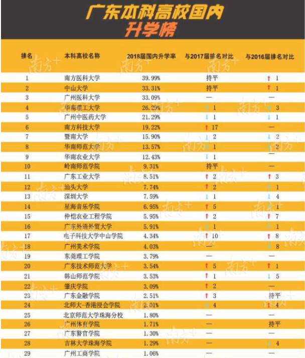 在發(fā)布“薪酬榜”后(點擊查看“薪酬榜”),今天南方教育智庫繼續(xù)獨家推出廣東高校“升學榜”,梳理全省123所高校發(fā)布的《2018年畢業(yè)生就業(yè)質(zhì)量年度報告》的關(guān)鍵數(shù)據(jù),聚焦畢業(yè)生的深造路徑和升學比例。其中南方醫(yī)科大學、中山大學、廣州醫(yī)科大學本科畢業(yè)生國內(nèi)升學率位列前3名,均超過33%。