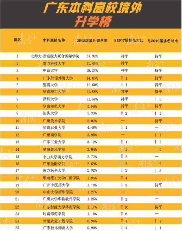 廣東外語外貿(mào)大學境外留學人數(shù)顯著提升,2018屆共有275人升入世界排名前100名的高校深造。兩所內(nèi)地與香港合作創(chuàng)辦的大學在境外留學率上處于全省前列。北京師范大學-香港浸會大學聯(lián)合國際學院持續(xù)多年保持全省第1位,此次共有811人留學,其中481人就讀世界前100名的大學。香港中文大學(深圳)僅公布總升學率65.67%,該校就業(yè)處相關(guān)負責人介紹,升學率中絕大部分是境外留學,176名學生平均每人收到3份世界知名大學錄取通知書。