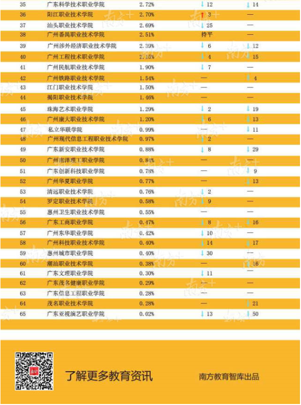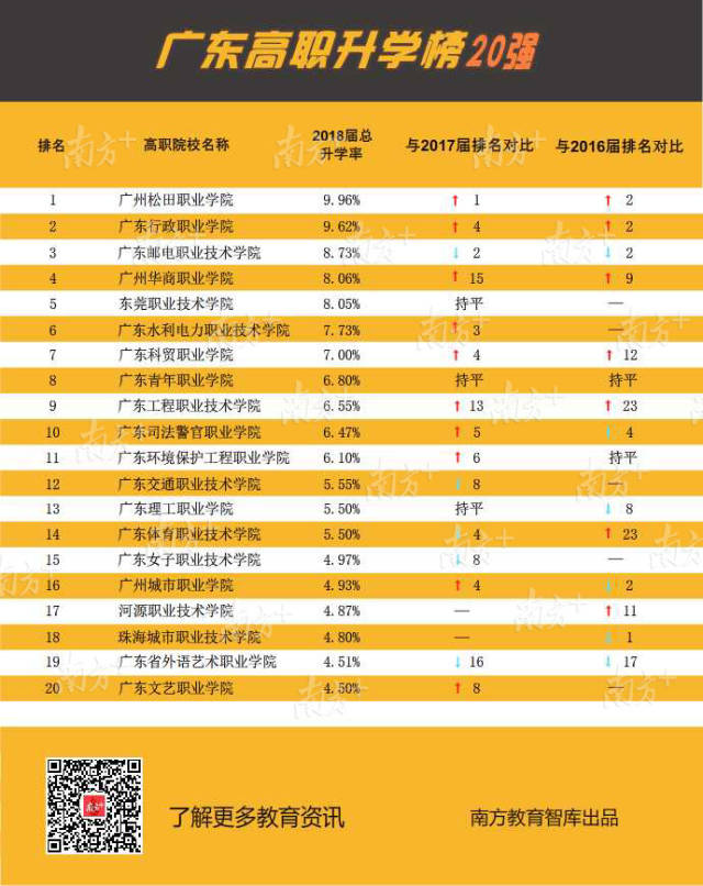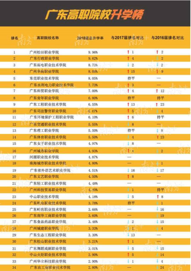 近3年各高職升學數(shù)據(jù)顯示,越來越多畢業(yè)生通過升學提升自身競爭力,尤其2018屆升學率增長明顯。其中有7所高職院校的畢業(yè)生升學率達到或超過7%,分別是廣州松田職業(yè)學院9.96%、廣東行政職業(yè)學院9.62%、廣東郵電職業(yè)技術(shù)學院8.73%、廣州華商職業(yè)學院8.06%、東莞職業(yè)技術(shù)學院8.05%、廣東水利電力職業(yè)技術(shù)學院7.73%和廣東科貿(mào)職業(yè)學院7.00%。