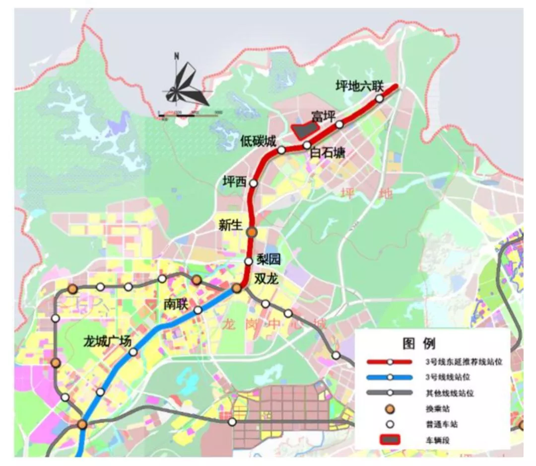 3號線東延線位于深圳市龍崗區(qū)境內(nèi),向東北方向延伸。線路全長約9.4公里,其中地上線約2.0公里,地下線約7.4公里。