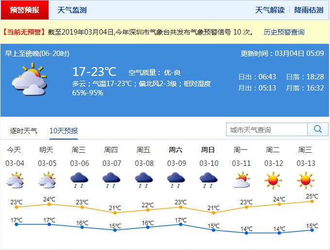 據(jù)市氣象臺消息,今天,深圳多云到陰天;氣溫17-19℃;相對濕度75%-95%;能見度普遍在10公里以上。受冷空氣影響早晨氣溫較昨天下降3-4℃,天氣清涼,注意及時(shí)添加衣物。 5日多云,部分時(shí)間可見陽光;6-10日冷暖空氣交替影響,云量較多,降雨頻繁,間中有雷雨,天氣清涼。