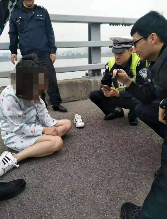 將女子從護(hù)欄上放下來(lái)后,為了防止女子再次做出過(guò)激舉動(dòng)民警們一邊形成“保護(hù)圈”,將其與高架護(hù)欄及過(guò)往車流隔開(kāi)一邊不斷對(duì)女子進(jìn)行安撫交流。