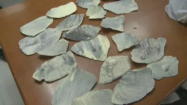 X光機隨后顯示出了一些神秘的黃色物體,該女子聲稱是樹葉。海關關員發(fā)現(xiàn),女子所說的“樹葉”每片都帶有褐色和淺黃色相間的花紋,淺黃色的地方顏色比較艷麗、通透,強光照射后還出現(xiàn)血色的紋理。