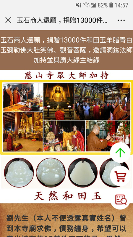 記者打開警方提供的網(wǎng)站鏈接,隨即便出現(xiàn)了香港某知名寺院的頁面,上面有不同的法師主持不同法事的照片。照片上方,赫然寫著"玉石商人還愿,捐贈(zèng)13000件和田玉羊脂青白玉彌勒佛大肚笑佛、觀音菩薩,邀請 XX法師加持并與廣大緣主結(jié)緣"的字樣。接下來網(wǎng)頁上便講述了一個(gè)漏洞百出、文理不通的"傳奇故事"——