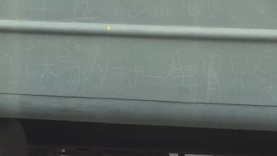 今天中午,記者來到現(xiàn)場,看見兩節(jié)火車的車廂上都有多處被不文明涂寫的痕跡。有些痕跡是用手指直接涂寫的,有些則是用尖利器物刻寫。內(nèi)容大都是刻上名字,表達(dá)愛意,到此一游,甚至是寫詩。