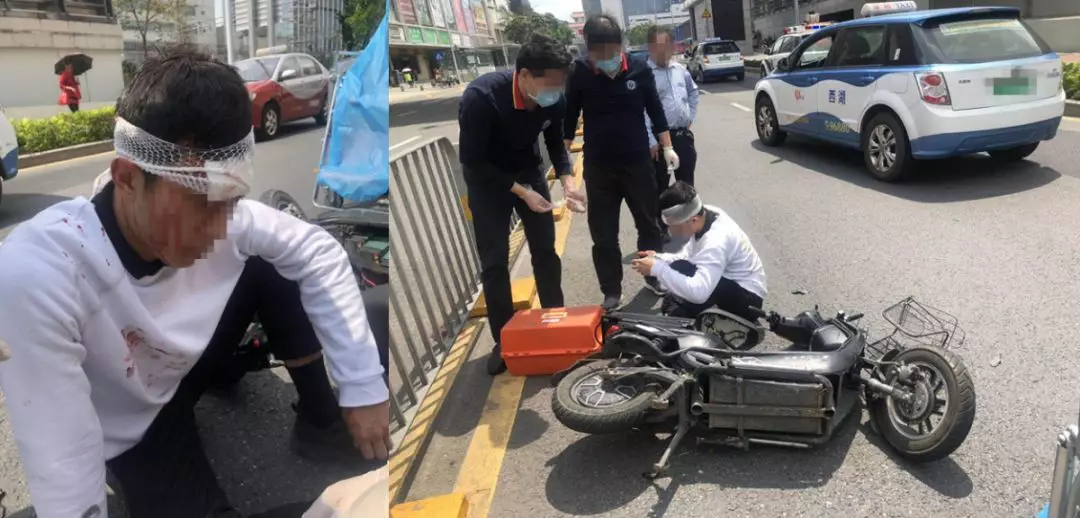 由反向橫穿馬路而來的電動車與曾某駕駛的出租車發(fā)生碰撞,電動車應(yīng)聲倒地,駕駛員吳某頭部受傷,流血不止,電動車受損嚴(yán)重!