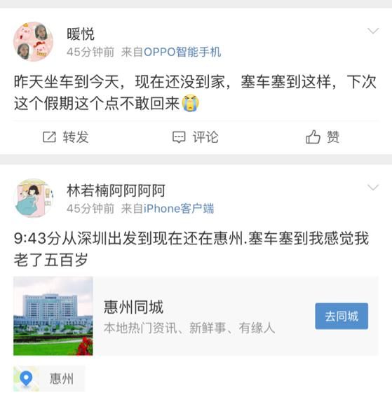 在等待他平按抵達(dá)期間,小編翻看了一下朋友圈與微博,發(fā)現(xiàn)許多人的回家路,一如既往地變成了一個(gè)個(gè)鐘數(shù)。