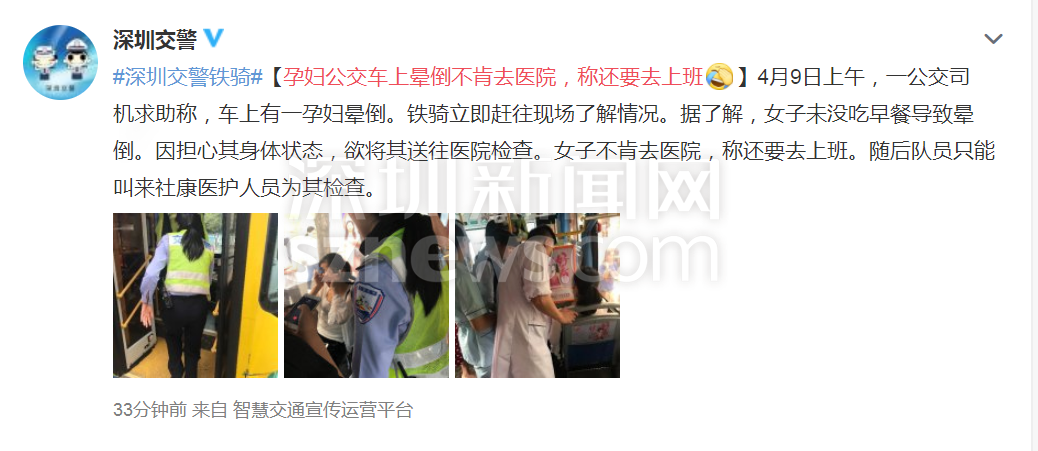 深圳新聞網2019年4月9日訊(記者 施冰冰)記者從“深圳交警”處了解到,4月9日上午,有公交司機求助稱,車上有一孕婦暈倒。鐵騎立即趕往現場了解情況。據了解,女子未沒吃早餐導致暈倒。因擔心其身體狀態(tài),欲將其送往醫(yī)院檢查。女子不肯去醫(yī)院,稱還要去上班。隨后隊員只能叫來社康醫(yī)護人員為其檢查。
