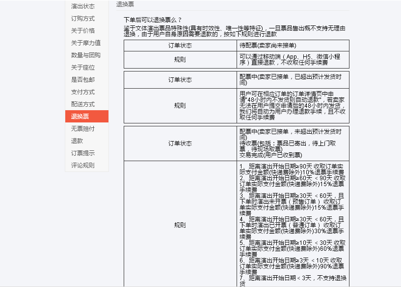 記者隨后從該網(wǎng)站的“訂票提醒”中的退換票規(guī)則中看到,該網(wǎng)站的退換票手續(xù)費實行“階梯費率”,如距離演出開始日期90天或以上,要收取訂單實際支付金額(快遞費除外)10%退票手續(xù)費;距離演出開始日期3天或以上但不超過10天,要收取訂單實際支付金額(快遞費除外)90%退票手續(xù)費,距離演出開始日期3天以內(nèi),則不支持退換貨。