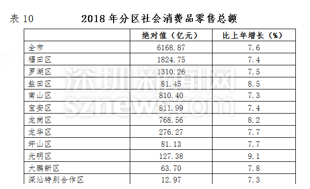 2018年,深圳全市社會消費品零售總額6168.87億元,比上年增長7.6%。按消費類型分,商品零售額5424.38億元,增長7.4%;餐飲收入額744.49億元,增長8.4%。