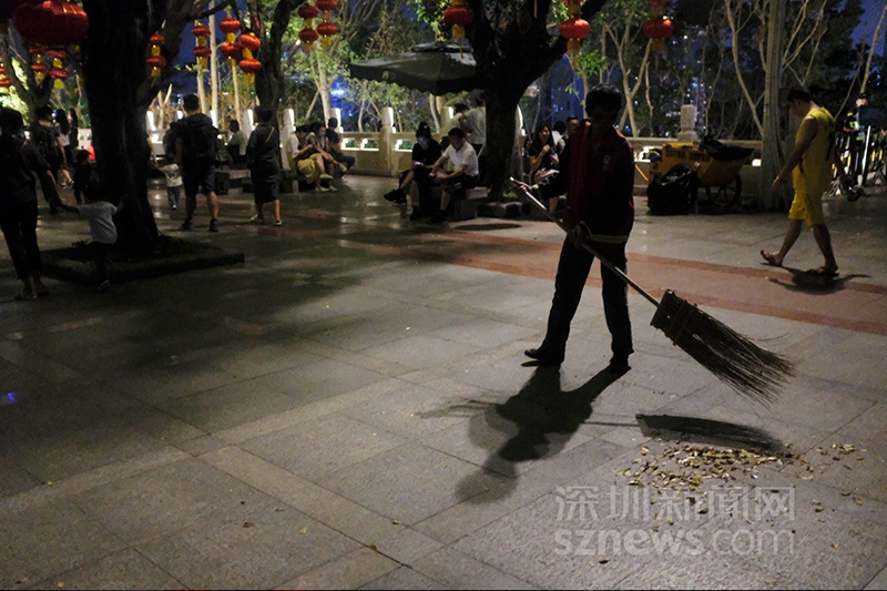 21時(shí),燈光秀結(jié)束后,蓮花山公園山頂廣場打掃衛(wèi)生的環(huán)衛(wèi)工(楊浩翰 攝)