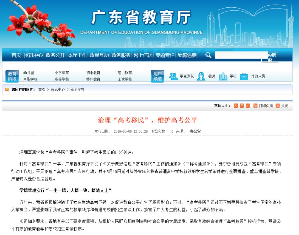 目前,深圳市已成立專項(xiàng)工作小組進(jìn)行調(diào)查。廣東省教育廳廳長景李虎昨天表態(tài),將在10號前對外省轉(zhuǎn)入生轉(zhuǎn)學(xué)條件進(jìn)行排查,并公布舉報郵箱,對“事情進(jìn)行徹底的整理”,明確:“一旦發(fā)現(xiàn)高考移民將安排回原籍高考,高考后發(fā)現(xiàn)高考移民將取消高考成績”。