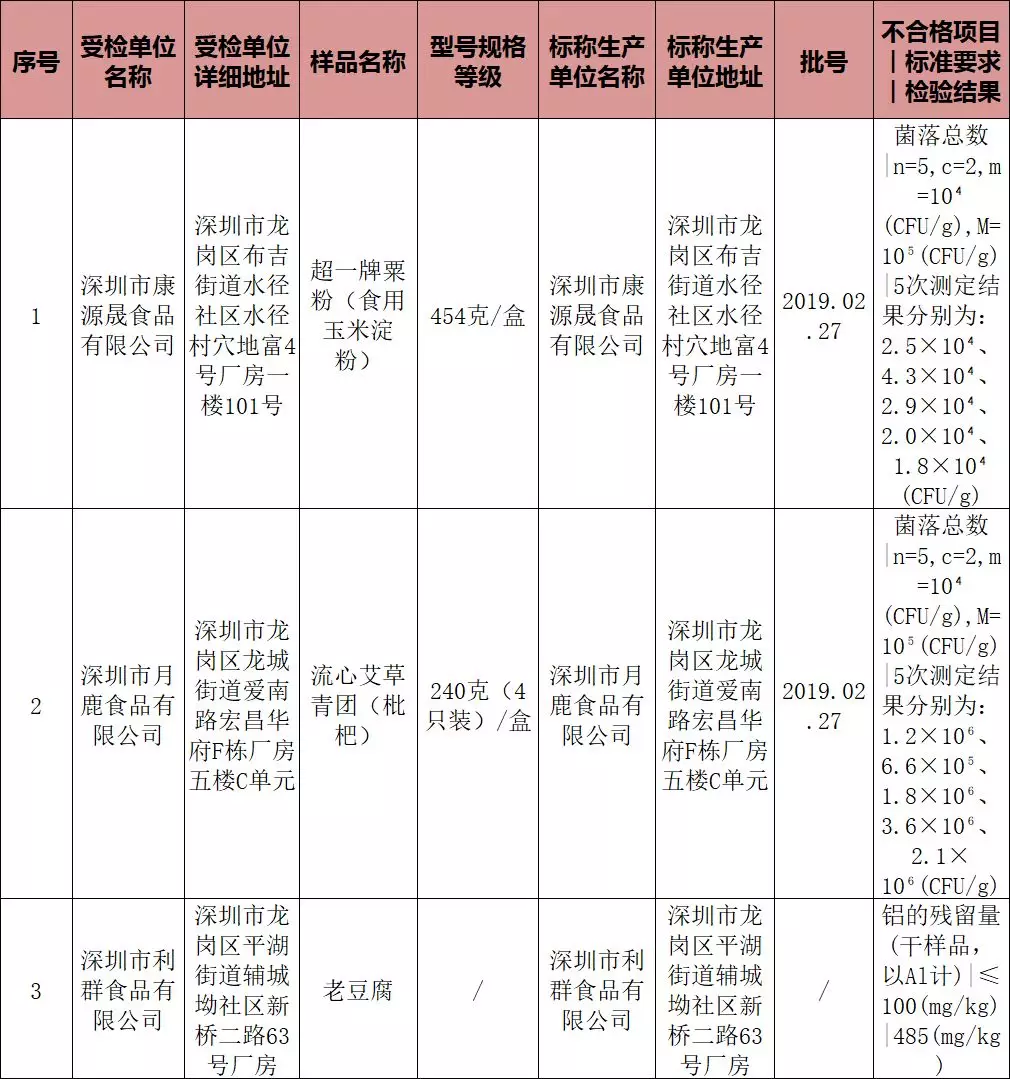 另有1批次食用玉米淀粉和1批次流心艾草青團皆被檢出菌落總數(shù)超標,它們的受檢單位依次是深圳市康源晟食品有限公司和深圳市月鹿食品有限公司。