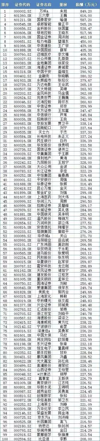 在2018中國(guó)A股上市公司董秘薪酬榜上,榜首為萬(wàn)科A的董秘朱旭,其2018年的年薪為849萬(wàn)元人民幣。三六零的王巍、國(guó)泰君安的喻健則位居第二、第三名,年薪分別是616萬(wàn)元人民幣、587萬(wàn)元人民幣。