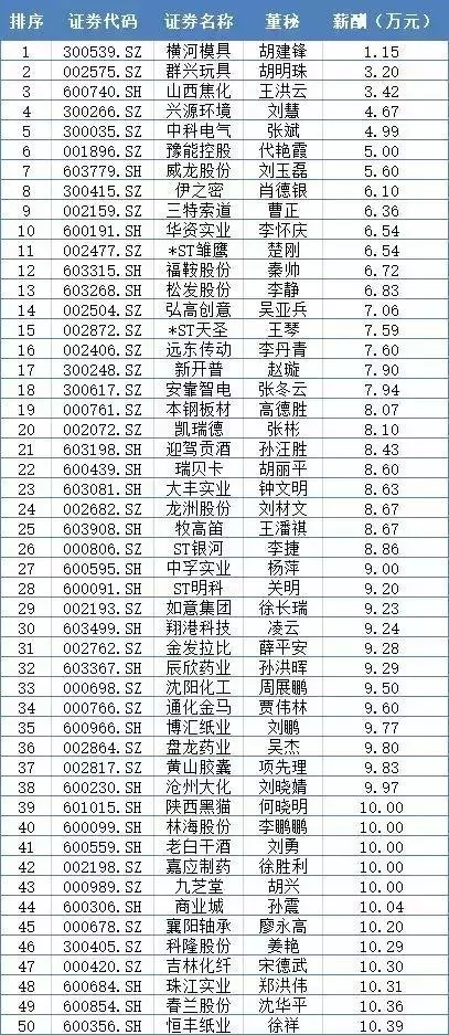 萬(wàn)科A董秘朱旭比暫時(shí)排在第二位的國(guó)泰君安董秘喻健高出260多萬(wàn),在中國(guó)董秘圈可謂身價(jià)最高。而薪酬最低的董秘為橫河模具的胡建鋒,年薪僅為1.15萬(wàn)元。