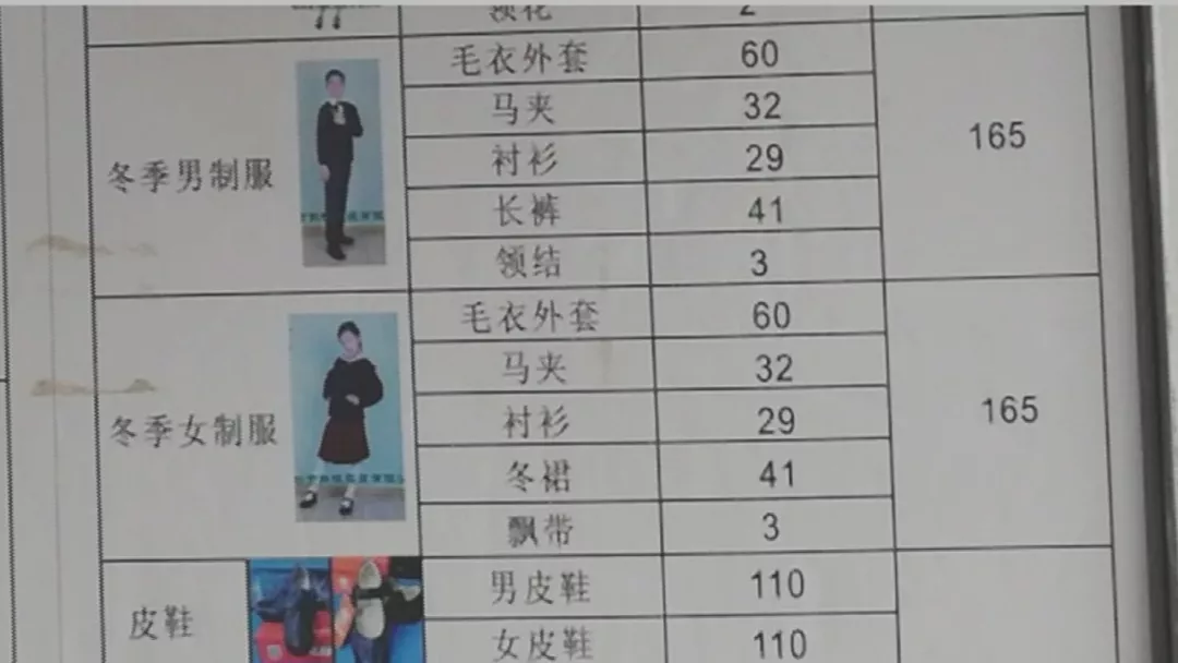 從龐女士發(fā)過來的圖片中記者看到,此前這家店的校服價格表中,小學學生冬季制服價格為165元。
