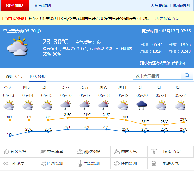 深圳新聞網(wǎng)2019年5月13日訊 深圳今日氣溫23-30℃,多云間陰天。市氣象臺預(yù)測,未來一周天氣持續(xù)炎熱,最高氣溫可達(dá)30-31 ℃。具體13-15日多云間晴天,早晚有輕霧,天氣炎熱,16-19日多云,部分時間有雷陣雨,中午前后天氣炎熱。