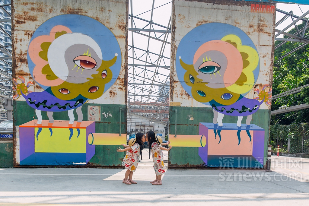 在城市公共空間中,涂鴉藝術(shù)不僅是一種重要的人文景觀,同時(shí)還能給人一種視覺(jué)享受,使單一的生活變得富有色彩。來(lái)自中國(guó)香港的全職藝術(shù)家彭怡擅長(zhǎng)用涂鴉進(jìn)行故事創(chuàng)作,帶來(lái)作品《雙觀》,以左右對(duì)稱(chēng)相望的停車(chē)場(chǎng)守護(hù)神的形象感染車(chē)主與行人,傳達(dá)平穩(wěn)冷靜的力量。