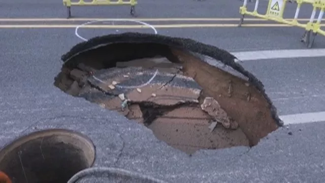 記者在現(xiàn)場看到,海德一道靠近后海濱路的道路中間形成了一個大坑,坑內(nèi)還有不少污水,發(fā)出陣陣惡臭味。