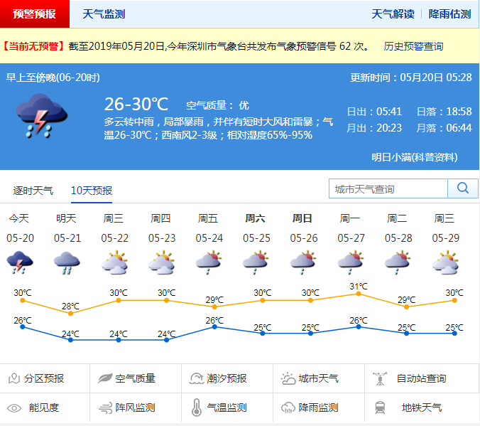 深圳新聞網(wǎng)2019年5月20日訊 周末兩天深圳天氣持續(xù)高溫,太陽輻射強(qiáng),午后最高氣溫普遍在33-35℃,體感悶熱。千呼萬喚的降雨降溫終于來了,市氣象臺預(yù)測,未來兩日有強(qiáng)對流天氣,20日更有暴雨以上降雨,高溫暴曬天氣有所緩解。