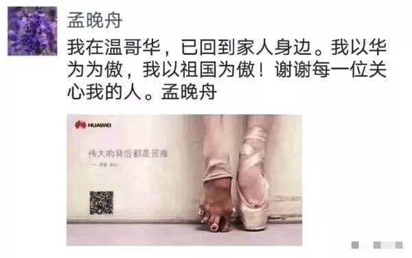當(dāng)?shù)貢r(shí)間2018年12月1日,加拿大當(dāng)局應(yīng)美方要求,扣留了在加拿大機(jī)場(chǎng)轉(zhuǎn)機(jī)的孟晚舟,美國(guó)隨后承認(rèn),正在尋求對(duì)孟晚舟的引渡。10天之后,2018年12月11日,加拿大法院作出裁決,批準(zhǔn)孟晚舟的保釋申請(qǐng)。當(dāng)晚,走出法庭的孟晚舟發(fā)朋友圈表示,我以華為為傲,我以祖國(guó)為傲。配圖就是那張“芭蕾腳”的華為廣告圖,上面寫(xiě)著:偉大的背后都是苦難。外界擔(dān)心,由于不斷升級(jí)的中美貿(mào)易摩擦,可能會(huì)影響到孟晚舟在加拿大的引渡訴訟。