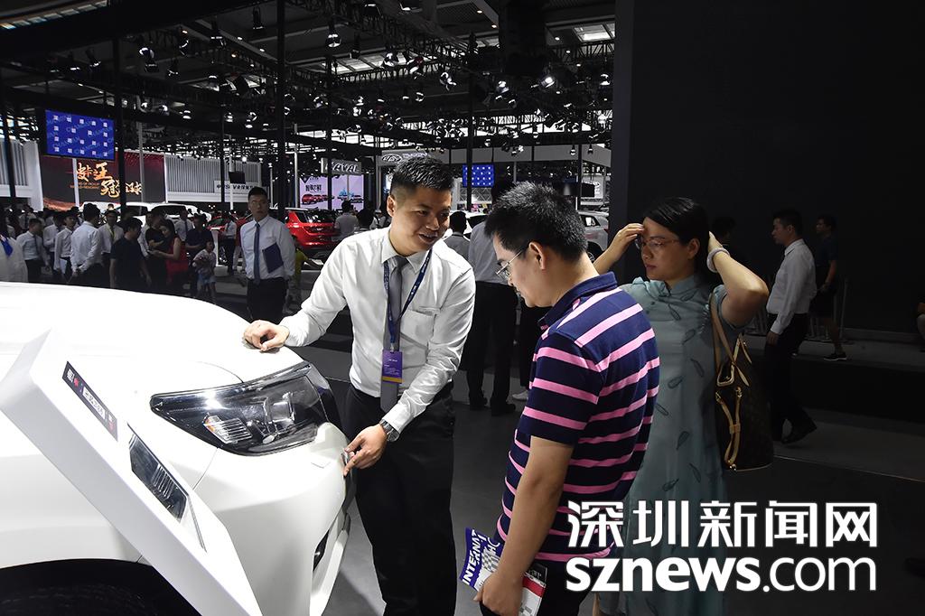 購車顧問向有意向買車的市民介紹車輛性能