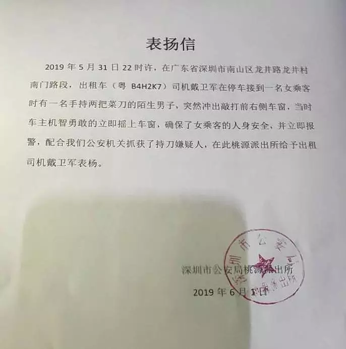 由于戴衛(wèi)軍的冷靜處理,這起治安隱患事件發(fā)生不到半小時,涉案嫌疑人就被警方成功抓獲歸案。為了贊揚戴衛(wèi)軍見義勇為的義舉,桃源派出所還專程向戴衛(wèi)軍送上了表揚信。