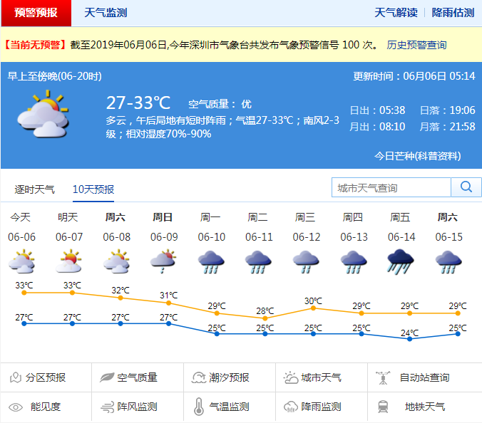 深圳新聞網(wǎng)2019年6月6日訊 今天白天,全市多云,午后局地有短時(shí)陣雨;氣溫27-33℃;南風(fēng)2-3級(jí);相對(duì)濕度70%-90%。天氣炎熱,市民外出請(qǐng)注意防暑降溫,參加戶外活動(dòng)時(shí)需及時(shí)補(bǔ)充水分。