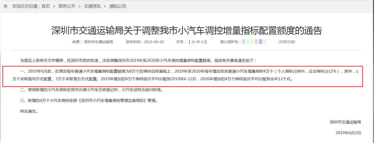 6月2日,深圳市交通運輸局發(fā)布了關(guān)于調(diào)整我市小汽車調(diào)控增量指標配置額度的通告