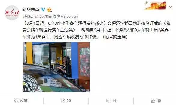 核載8人和9人車輛由原2類客車降為1類客車,降低了對(duì)應(yīng)車輛的收費(fèi)標(biāo)準(zhǔn)