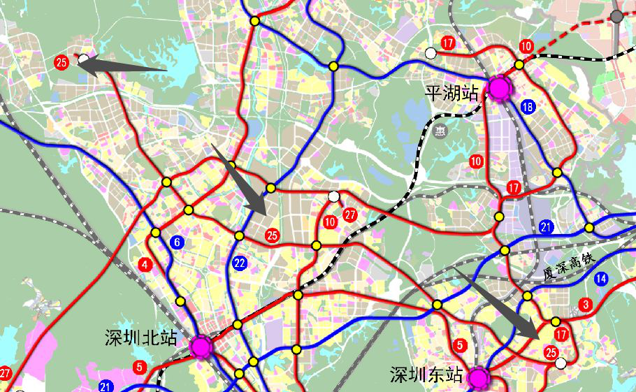 根據(jù)《深圳市城市軌道線網(wǎng)規(guī)劃(2016-2030)》,25號線定位為支撐深圳市北部發(fā)展帶的普速服務線。線路聯(lián)系龍華、坂田、布吉等橫向二圈層片區(qū),增加沿線片區(qū)的軌道覆蓋率,加強橫向聯(lián)系,同時與5條縱向軌道快、干線換乘,喂給客流,完善軌道線網(wǎng)結構。
