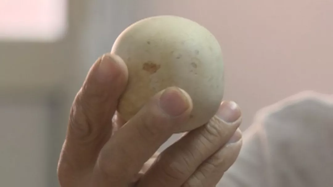說他手上有塊白色圓石頭