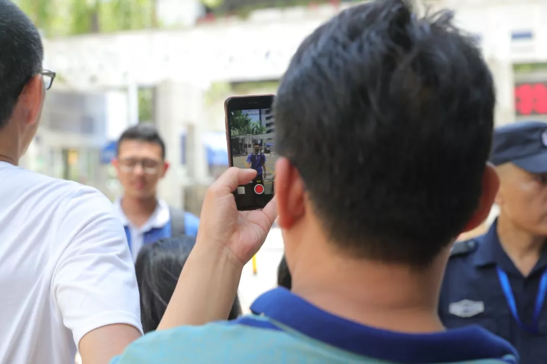 △考場(chǎng)外焦急等待的考生家長紛紛拿出手機(jī)準(zhǔn)備拍攝邁出考場(chǎng)的孩子。