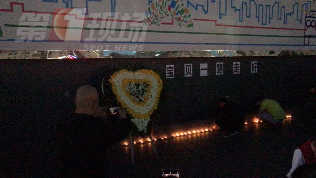 在廣場正中央,放立著一個心形花牌,大家在地上點上了蠟燭,墻面貼著“寶貝一路走好”。