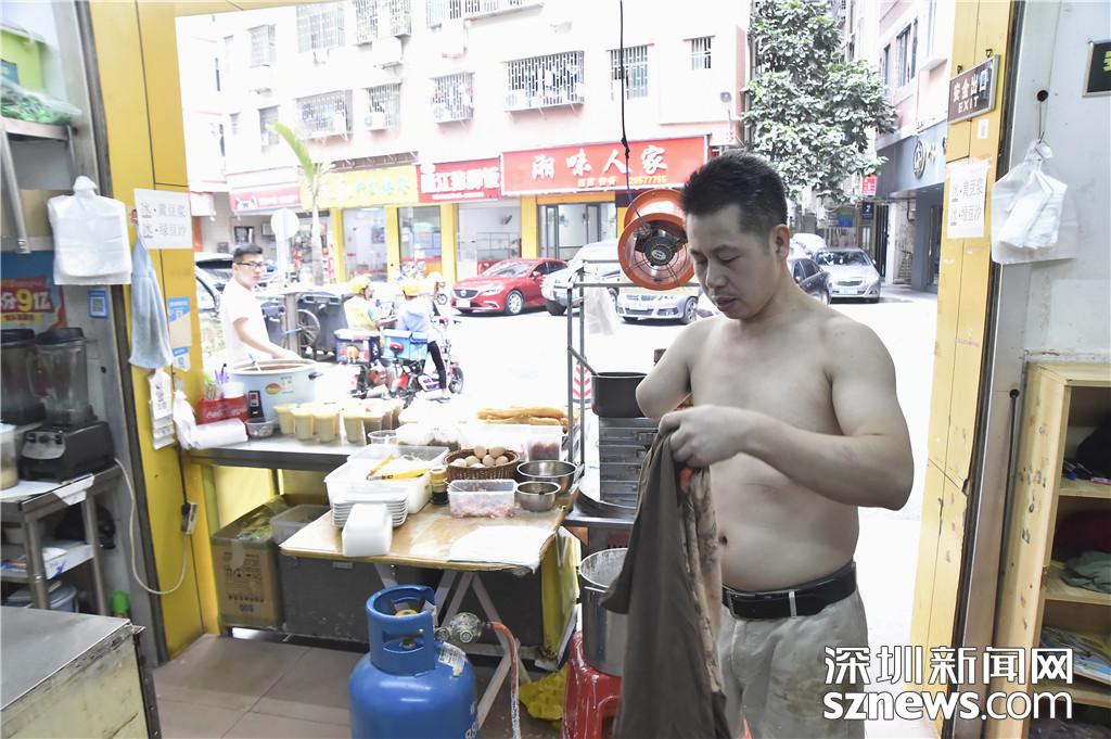 圖為空閑時(shí)間,陳用發(fā)脫下衣服擦汗
